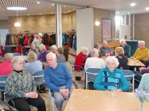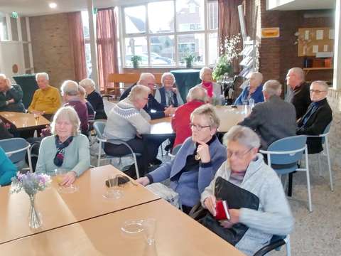De geweldige belangstelling voor deze ontmoeting van onze vereniging verraste het bestuur. Aangeboden als ‘vrije inloop’ (hoeveel zouden er komen?) werd het, na half vier een geanimeerd samenzijn van bijna 45 leden. Iedereen voelde zich vrij om in gesprek te gaan met deze en gene. De belangstelling voor elkaar was mooi om te zien en te ervaren, er werd regelmatig van stoel gewisseld. De bestuursleden waanden zich in een warm bad met zoveel betrokkenheid! Daar de sfeer ontspannen was, bleef bijna iedereen tot het einde.