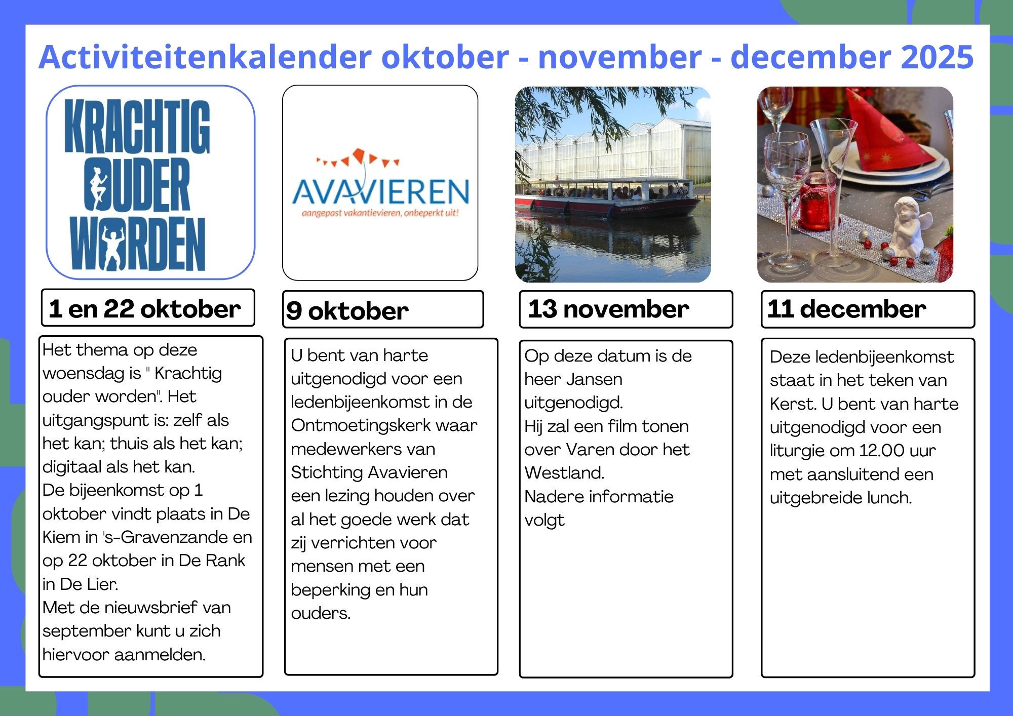 Klik op de link hieronder voor een overzicht van de activiteiten. De activiteiten worden per kwartaal aangegeven en zijn tot en met eind 2025 bekend. Nadere informatie over bijvoorbeeld aanmelden ontvangt u via onze nieuwsbrief.