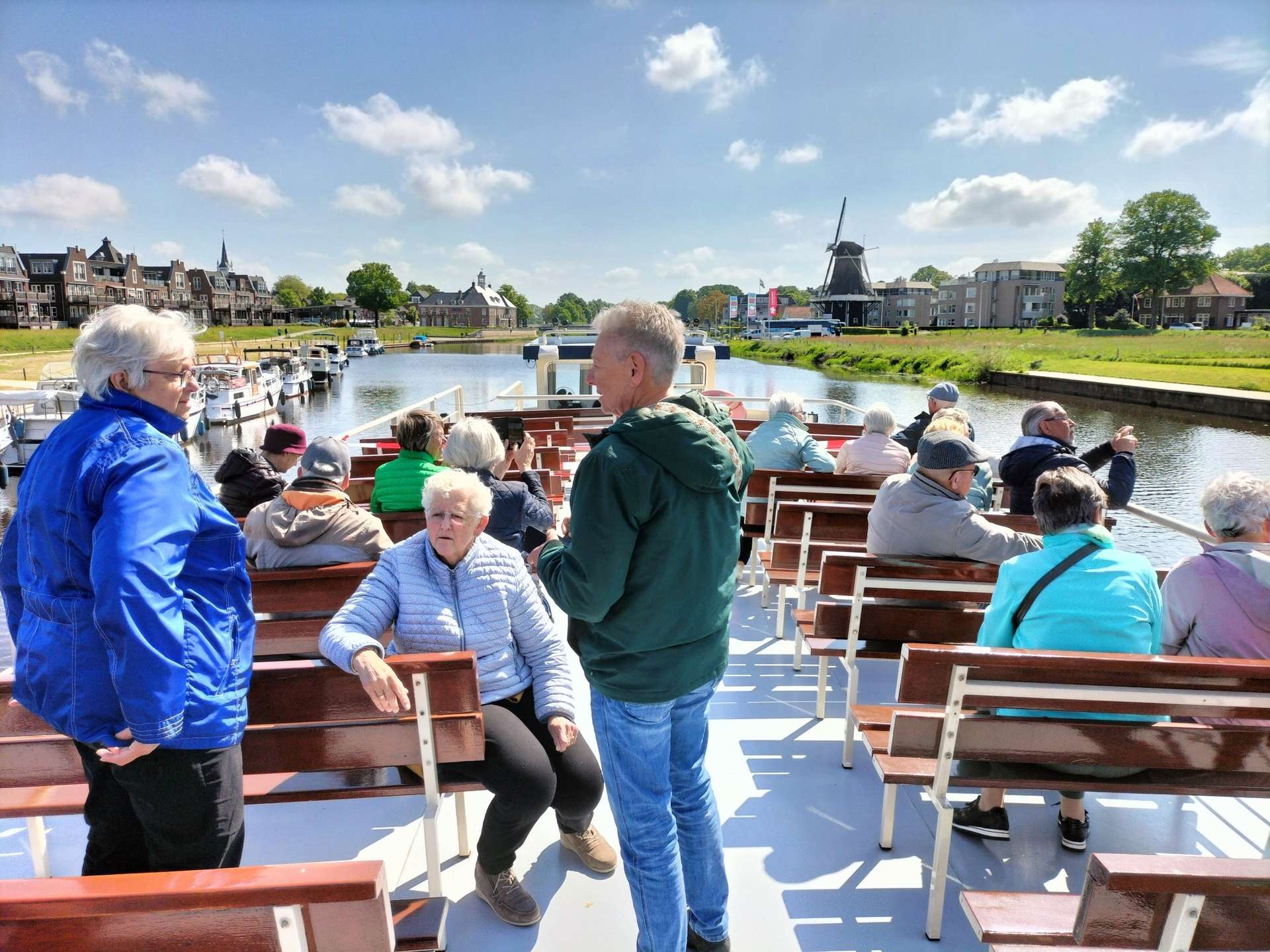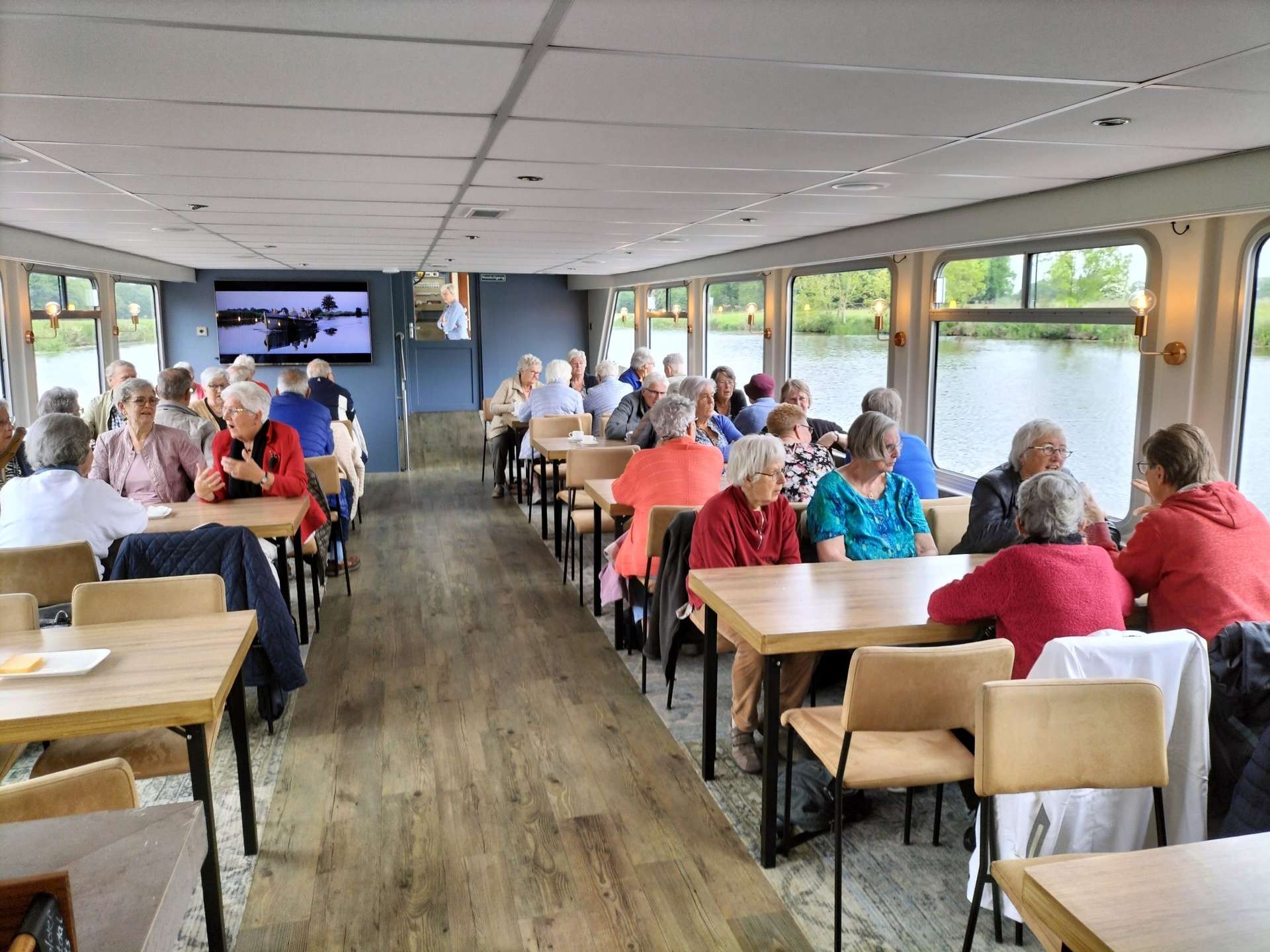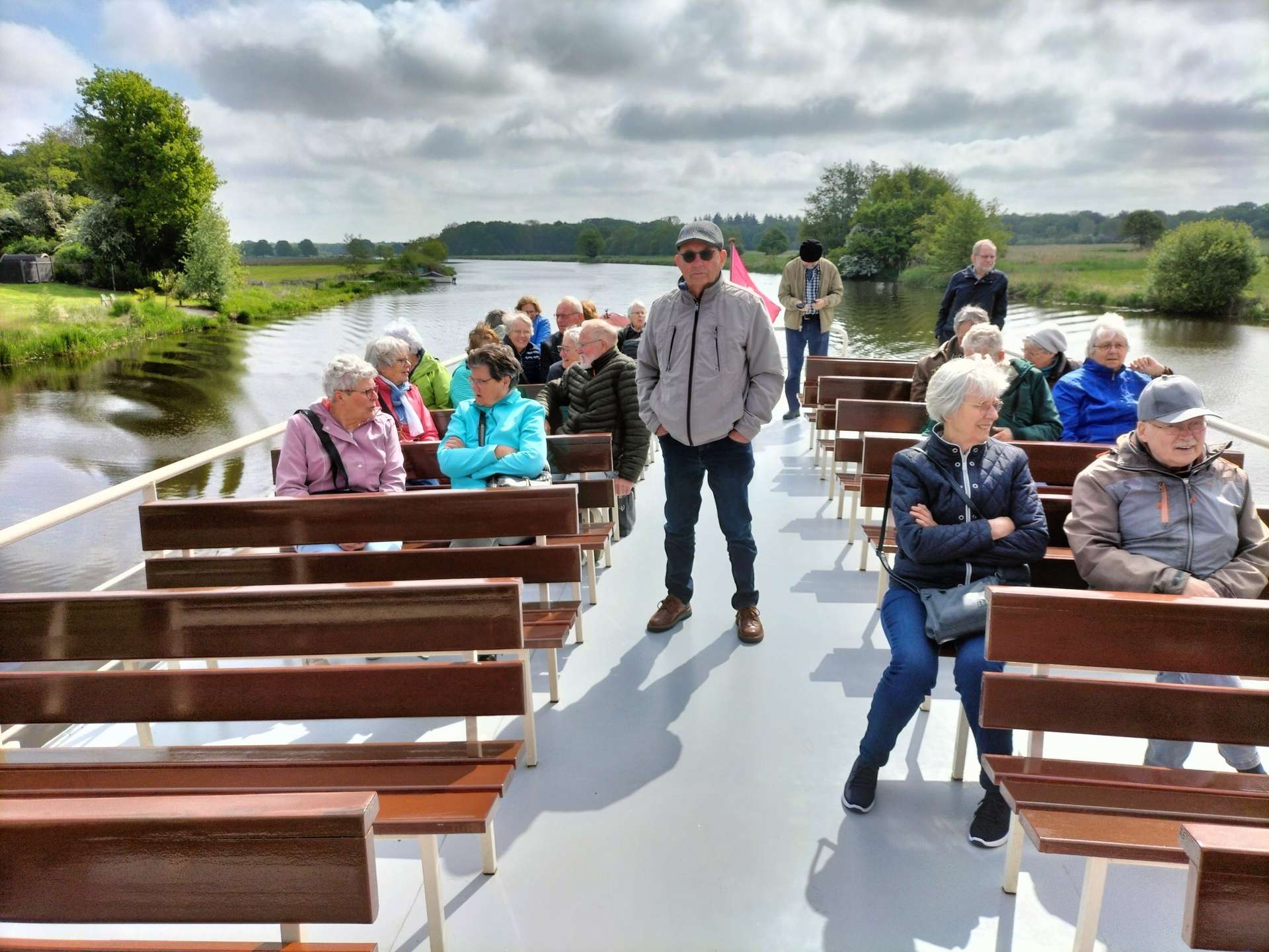 Na aankomst ging de groep aan boord van de 'Oueen Vechtvalley' van rederij Peters voor een prachtige tocht over de Vecht. Maar niet voordat eerst iedereen was voorzien van koffie/thee met wat lekkers erbij en de kapitein het een en ander over de rivier de Vecht had verteld. Tijdens de boottocht zagen de 'passagiers' aan de waterkant verscheidene vissers zitten, maar ook mooie gele lissen bloeien. Voorts vissende reigers en overvlie-gende kokmeeuwen. En natuurlijk ontbraken de mooie roodbonte koeien niet.