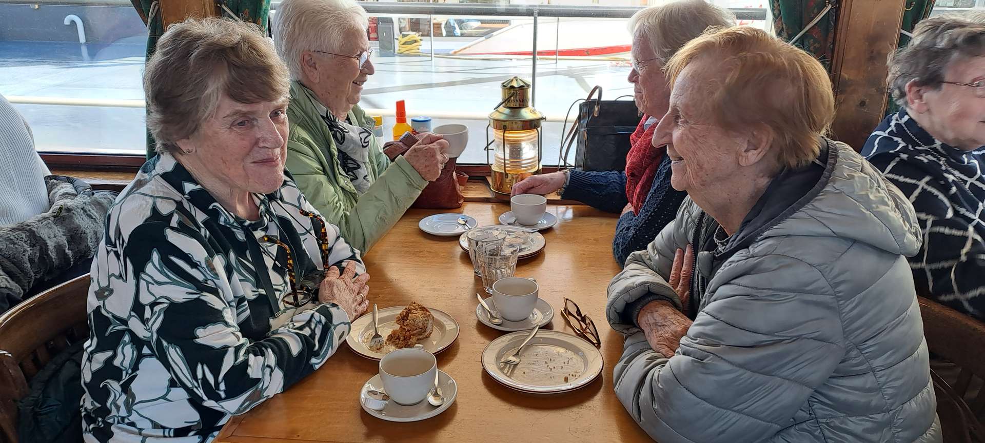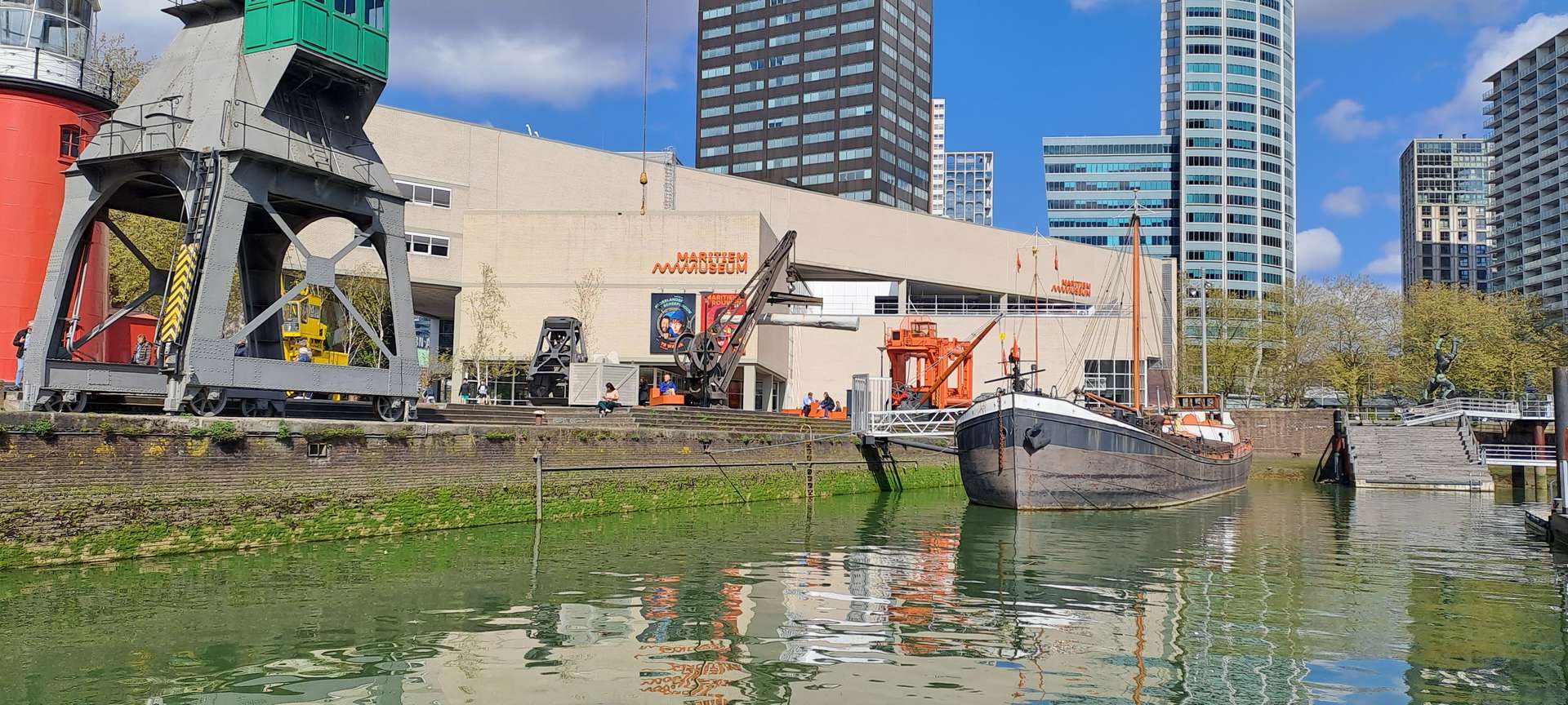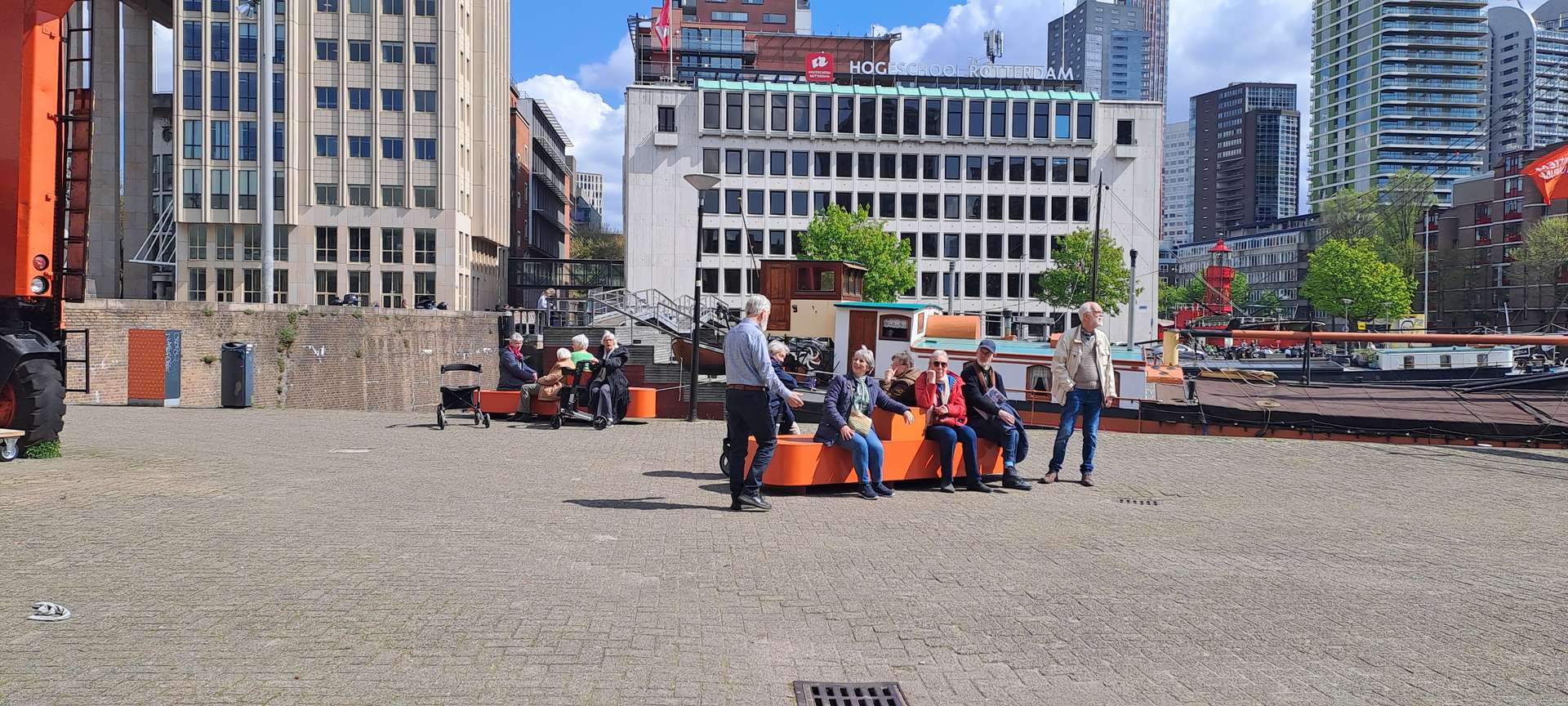 Na de koffie ging het richting het Maritiem Museum. Een groot, modern gebouw, goed toegankelijk voor onze rollatorgebruikers, met veel informatie over Rotterdam: De geschiedenis vanaf de allereerste nederzetting aan de monding van de Rotte, de grote groei in de Gouden Eeuw, het bombardement in 1940 en de stad nu met zijn grote verscheidenheid aan inwoners. Natuurlijk veel aandacht voor de havens die zich in de loop der eeuwen steeds meer vanuit het centrum van de stad richting Noordzee verplaatsten. Voor de scheepswerven die periodes van groei en van achteruitgang kenden en aan zoveel mensen werk verschaften, dat er hele dorpen voor werden gebouwd. En dankzij het schitterende weer, was het heerlijk om de schepen te bewonderen, die in de buitenhaven liggen of gewoon even lekker op een bankje daarnaar te kijken.