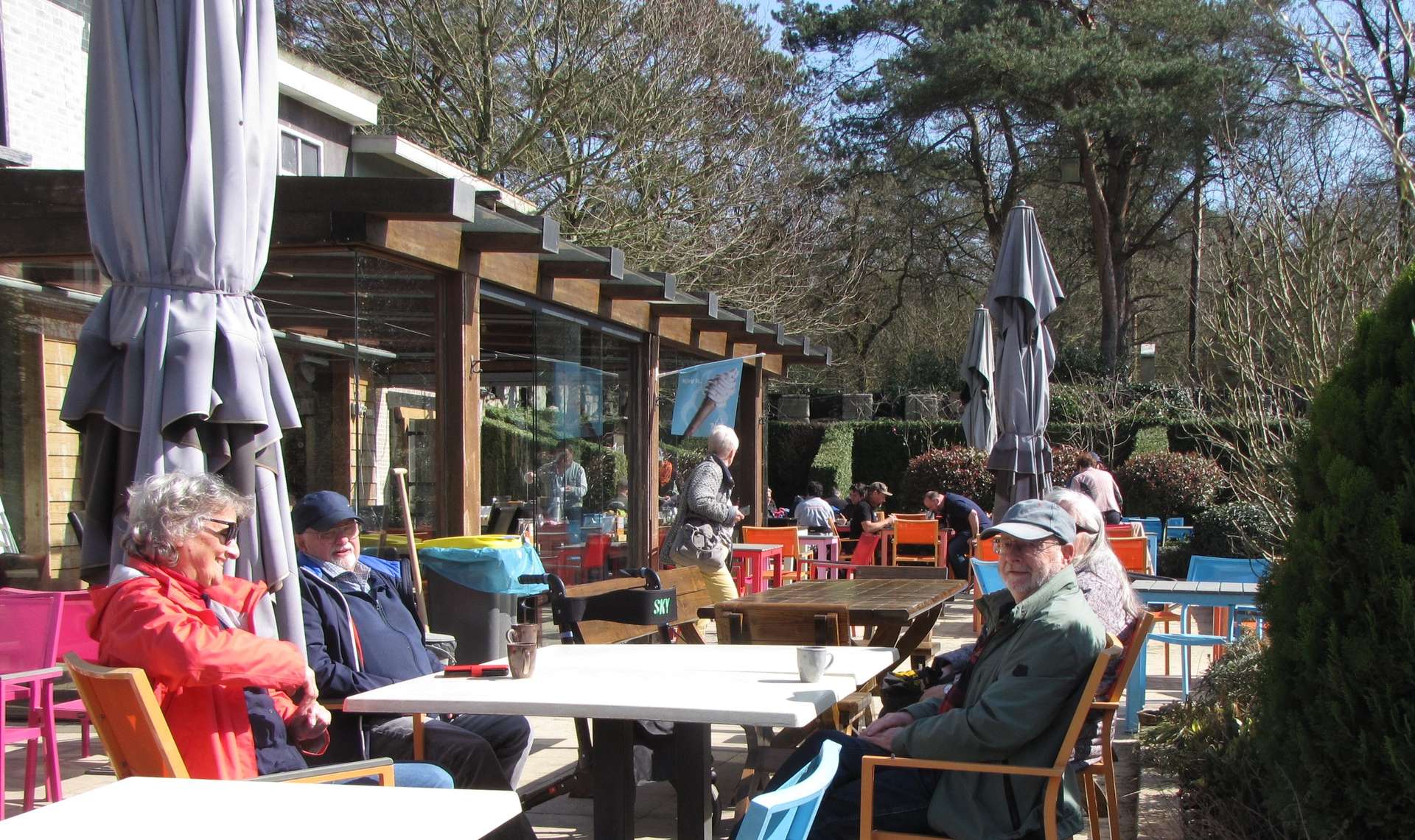 Na de lunch is er nog tijd om wat rond te lopen, bijvoorbeeld in de beeldentuin met betonnen en houten beelden, maar sommigen gebruiken die tijd om lekker in de zon op het terras met elkaar iets te drinken.
