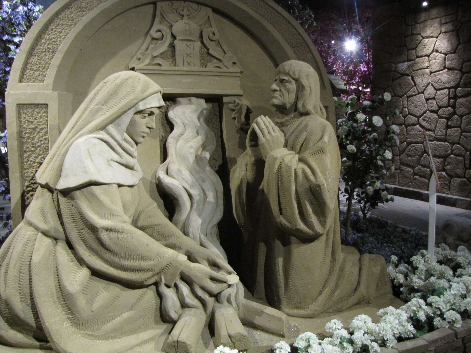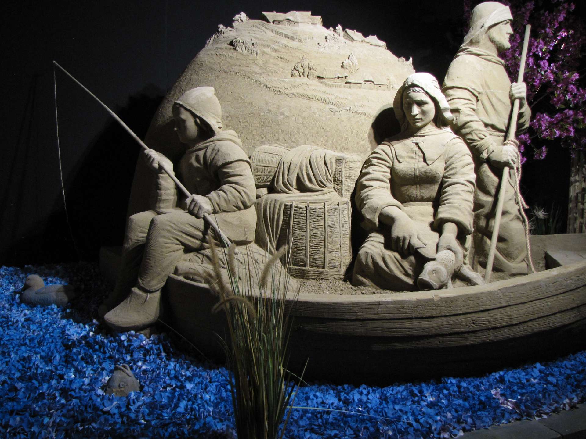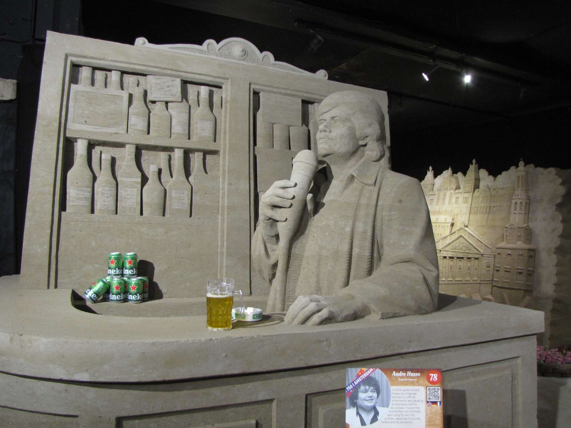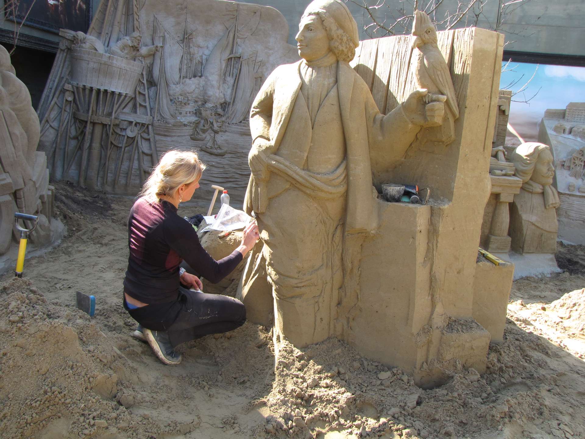 Het thema van Zandsculpturen Garderen is dit jaar het 750 jarig bestaan van Amsterdam. Bij aankomst werden we dan ook door een plat Amsterdams sprekende vrouw ontvangen. Terwijl de koffie met gebak werd uitgeserveerd, vertelde zij over het programma van deze dag en de tentoonstelling.