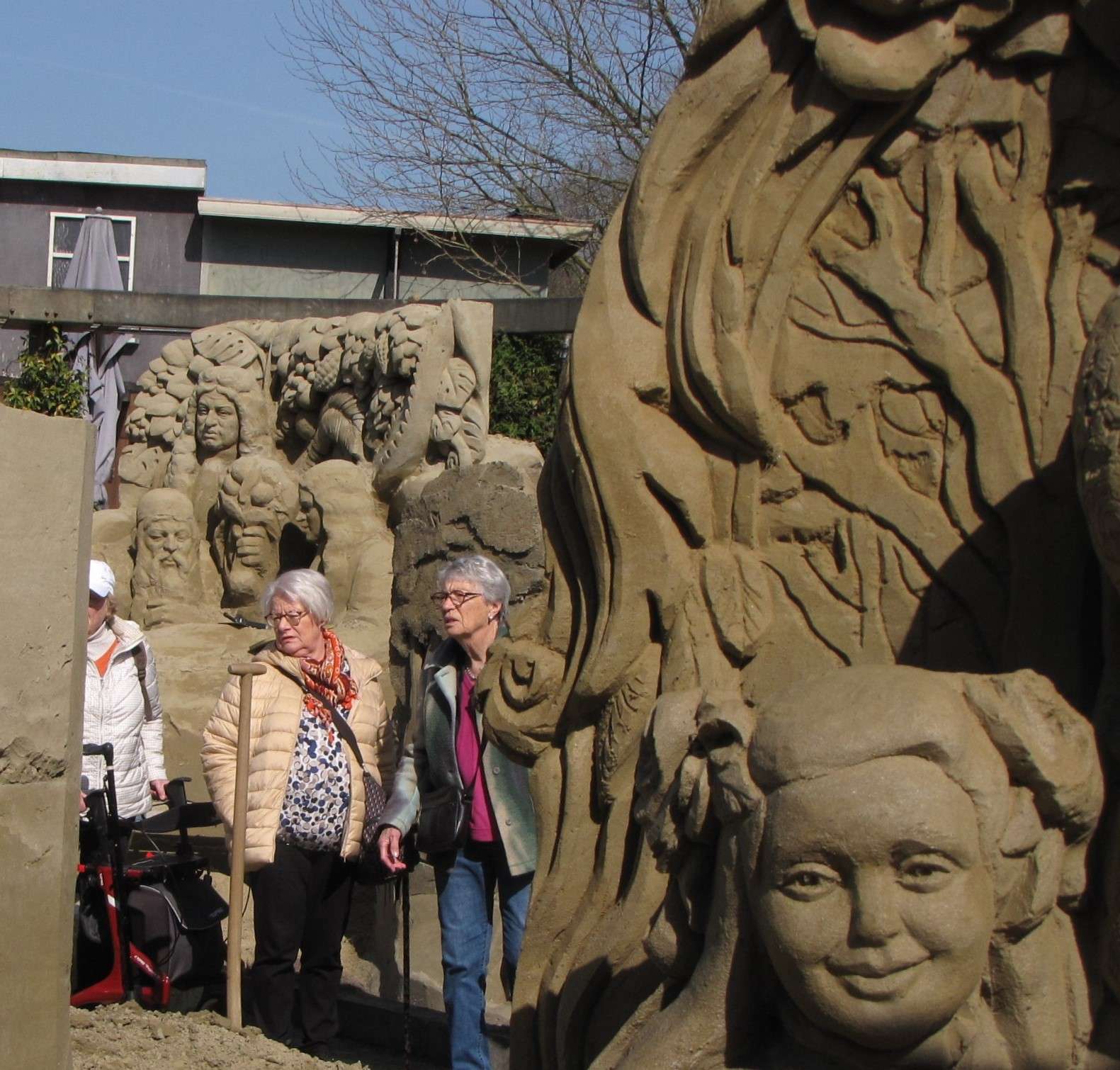 De beelden schijnen prima tegen regen bestand te zijn, maar dat is vandaag niet aan de orde. Het is schitterend weer en iedereen loopt in eigen tempo, met of zonder rollator, de route langs de schitterende zandsculpturen. Regen mag dan geen kwaad doen aan de beelden, maar vorst wel. En je mag ze natuurlijk niet aanraken. Daarvoor is een speciale dag aan het eind van het seizoen, waarop blinden en slechtzienden de beelden mogen betasten.