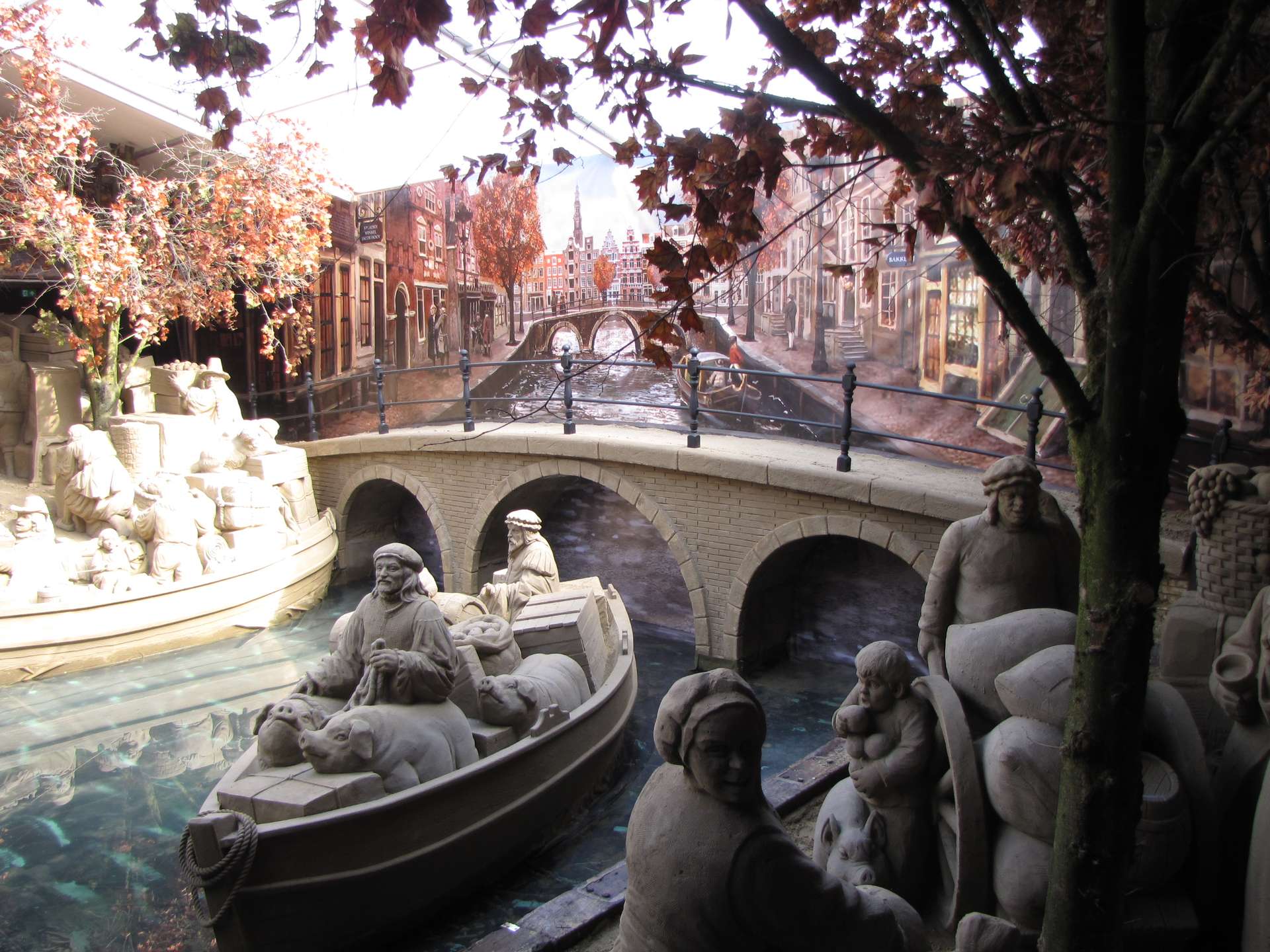 Het eerste deel van de route is binnen. Hier staan de beelden in een “aangeklede”, bij het onderwerp passende omgeving, in min of meer chronologische volgorde met uitleg over het ontstaan en de groei van Amsterdam. Buiten staan grote werkstukken waar soms nog door kunstenaars aan wordt gewerkt. Dat geeft ook gelegenheid om wat vragen te stellen; dikwijls in het Engels, want het blijkt een internationaal gezelschap te zijn.