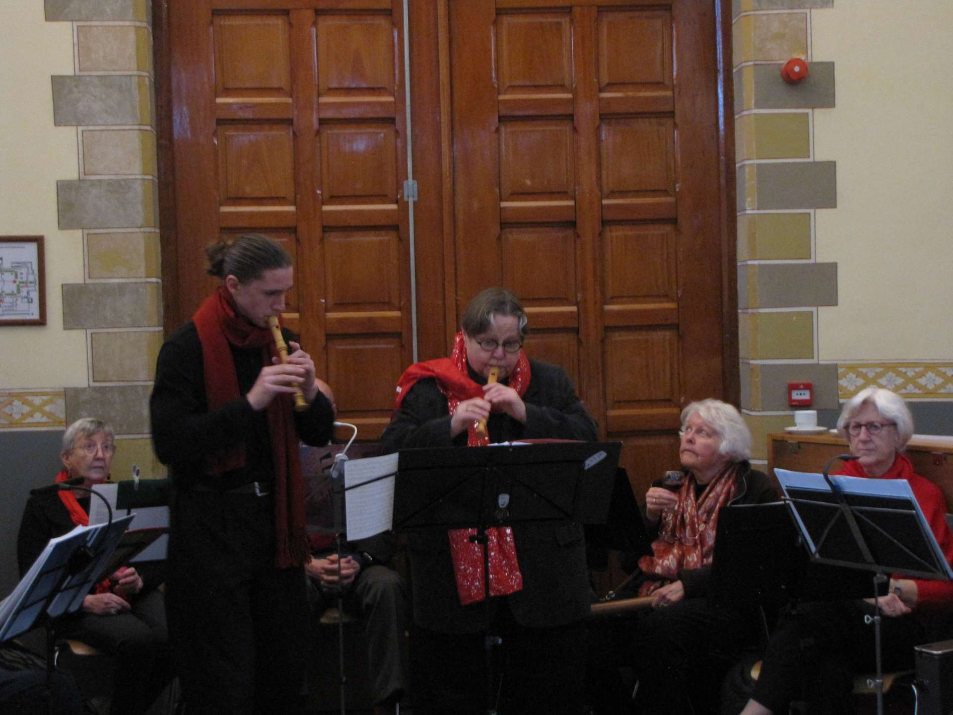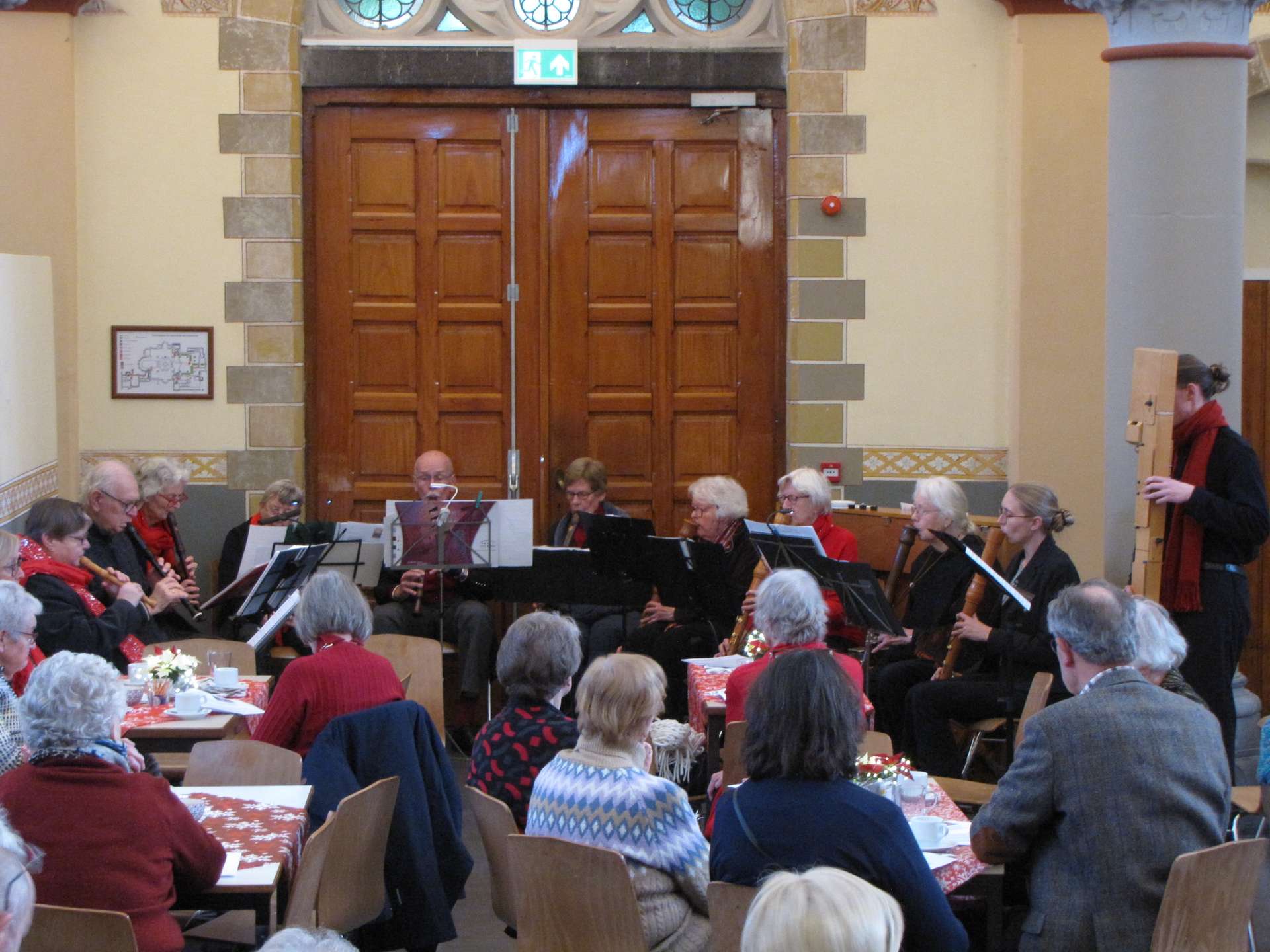 De elfkoppige blokfluitgroep Sarabande, onder leiding van Liesbeth Boertien, zorgde daarbij voor de begeleiding en speelde verder een aantal bij de kersttijd passende muziekstukken. Veel mensen kennen de blokfluit van hun eerste muzieklessen en hebben daar niet altijd even goede herinneringen aan, maar zo’n grote blokfluitgroep waarin alle soorten inclusief de contrabas blokfluit vertegenwoordigd zijn, klinkt echt fantastisch.