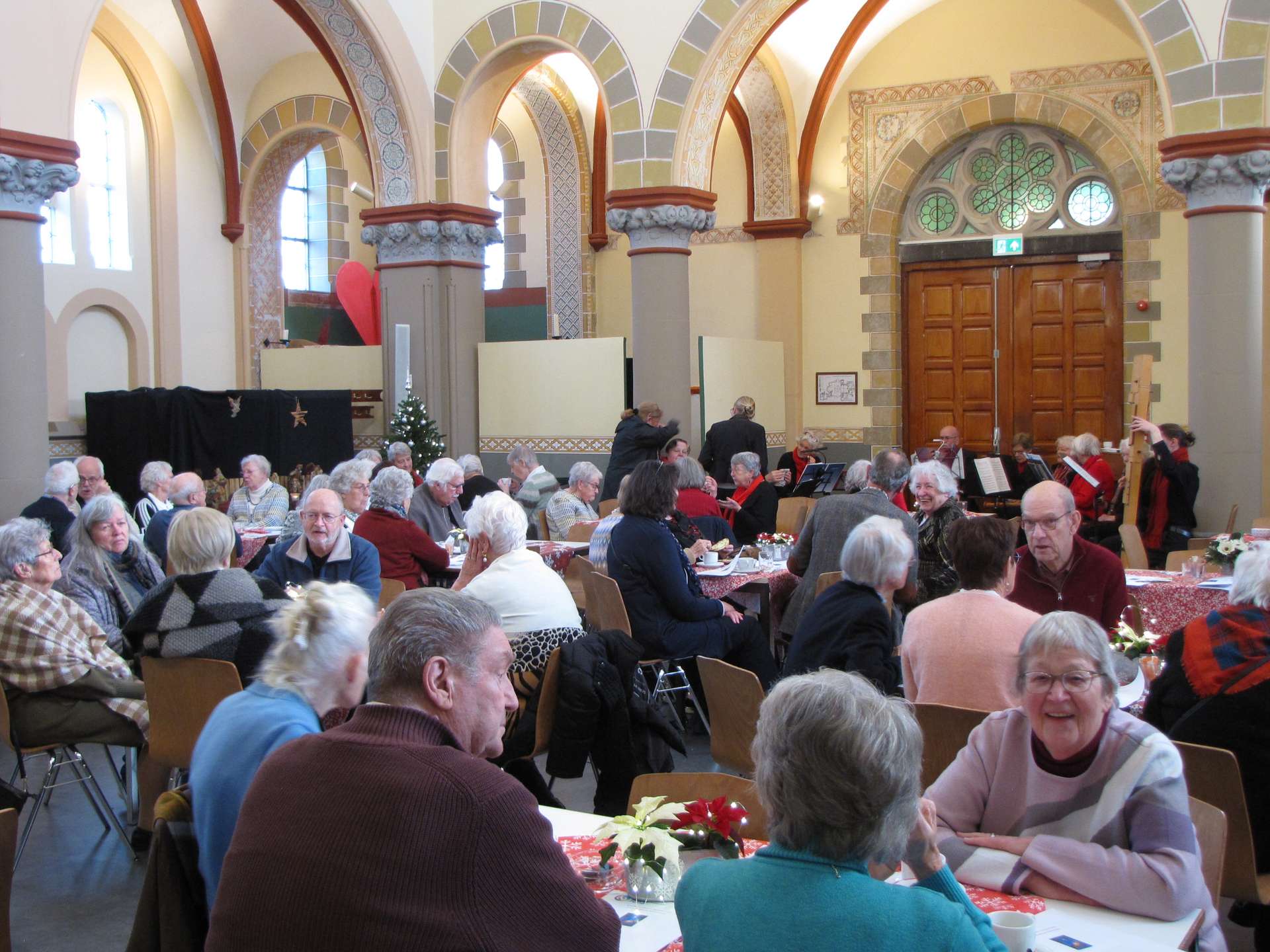 In een zonnig Atrium van de Goede Herderkerk genoten donderdag 12 december de leden van ANBO-PCOB Leiderdorp van de jaarlijkse de Kerstbijeenkomst. De ervaring van de voorgaande jaren had iedereen ertoe gebracht zich warm aan te kleden, maar dit keer was dat niet echt noodzakelijk.
