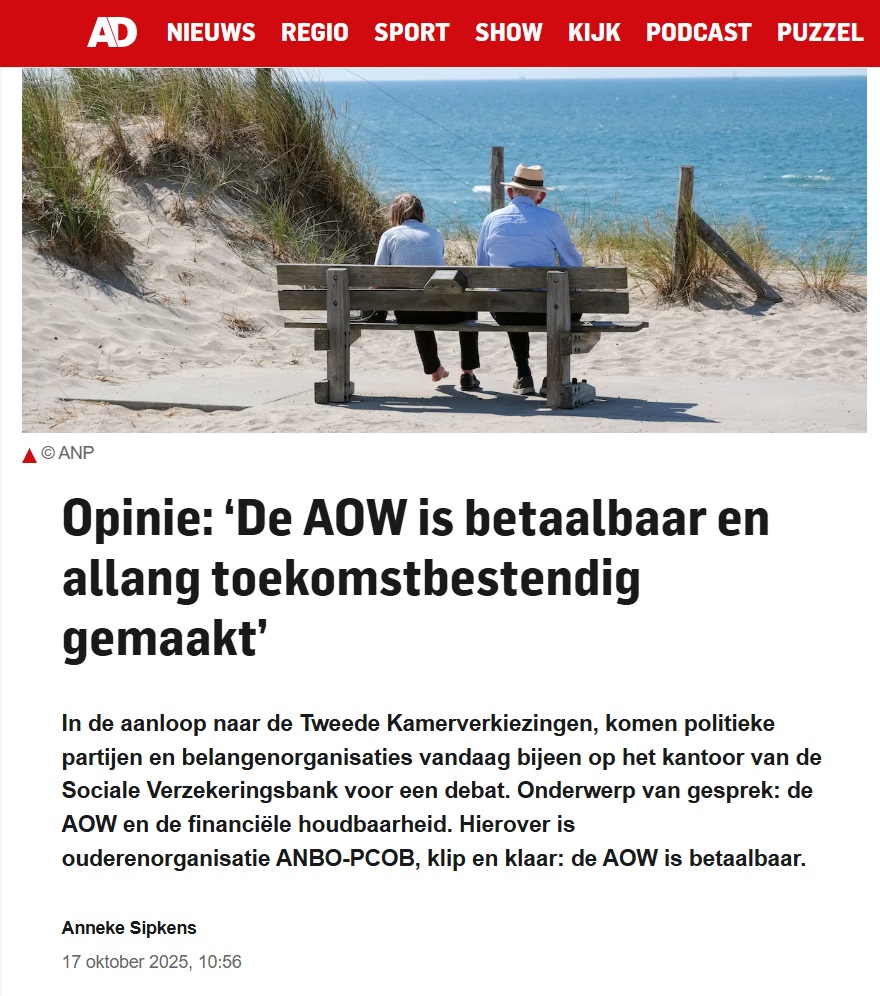 Op vrijdag 17 oktober heeft ANBO-PCOB in samenwerking met de Sociale Verzekeringsbank (SVB) een AOW-verkiezingsdebat gehouden. Politici van GroenLinks-PvdA, VVD, D66, CDA, NSC, BBB, SP, Volt en 50PLUS gingen hierin met elkaar in gesprek over de toekomst van de AOW.